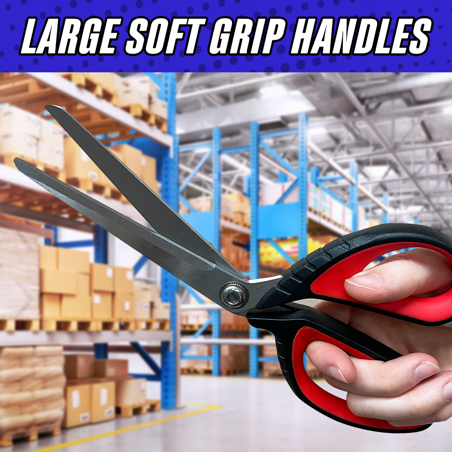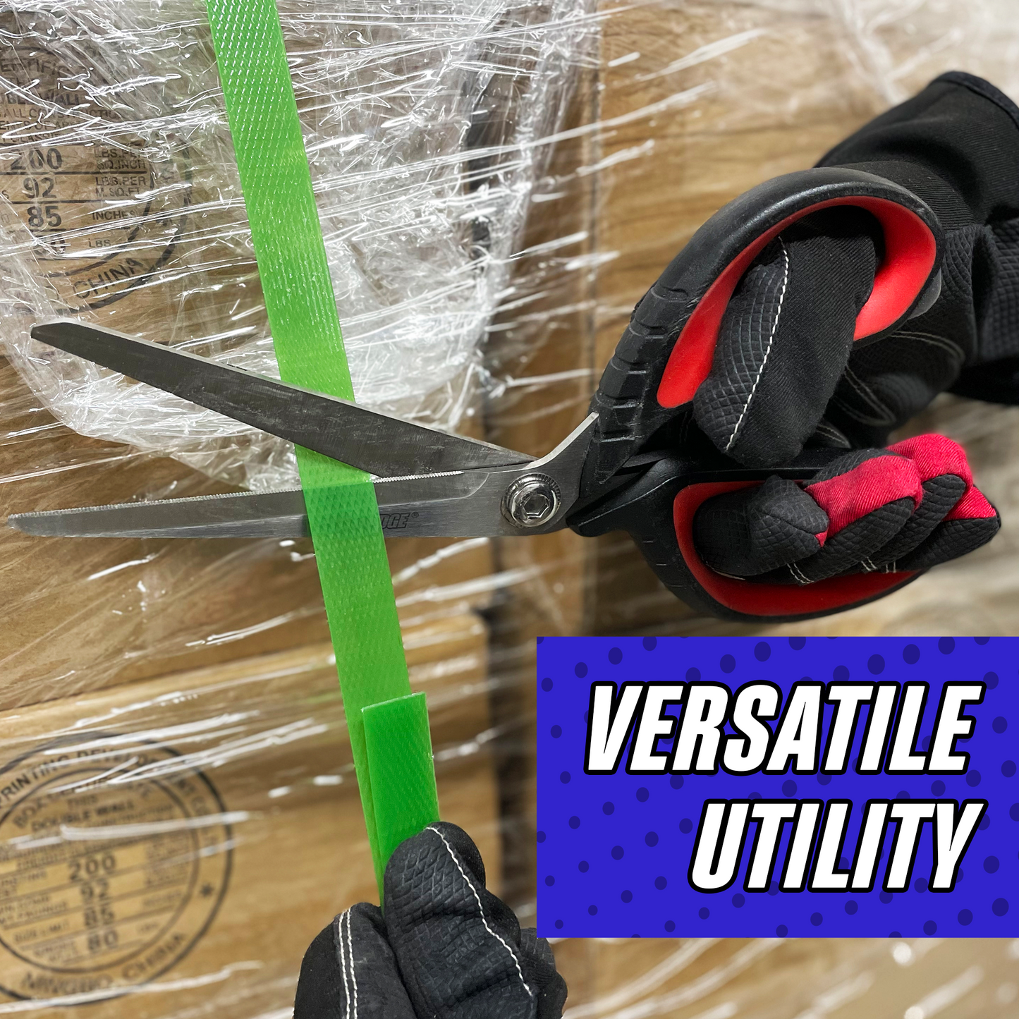 The Rapid Edge 9.5-inch heavy-duty scissors are built tough with a full metal core and sharp stainless steel blades. Their angled, serrated edge grips materials securely, making cutting through cardboard, plastic, rope, metal strapping, and more effortless. Lightweight and comfortable, the upsized ergonomic handles fit larger hands and gloves while providing excellent control. These versatile scissors are perfect for tackling a variety of tasks at home, in the workshop, or on the job.