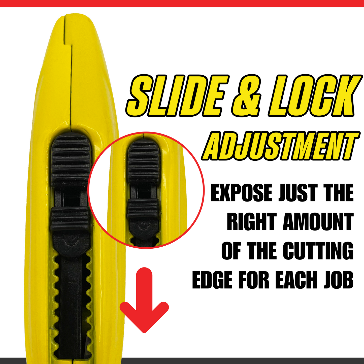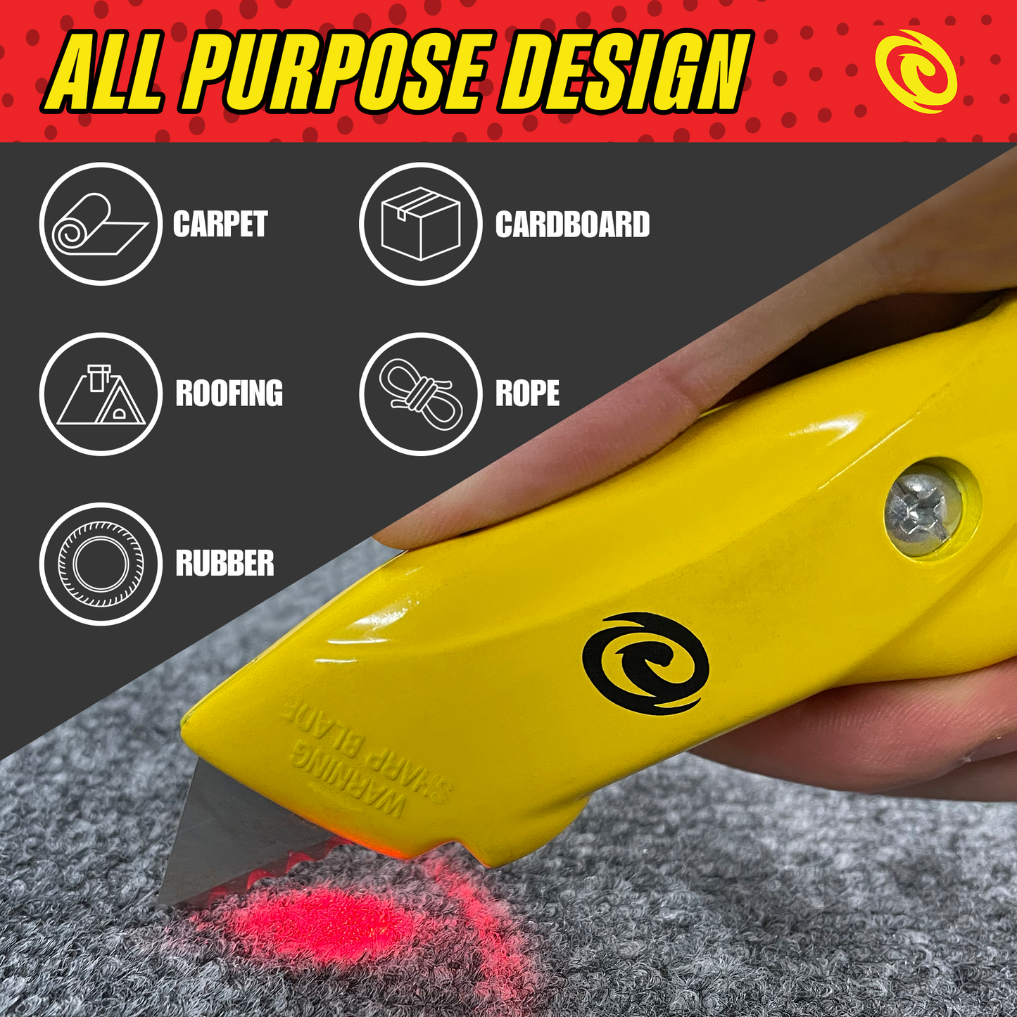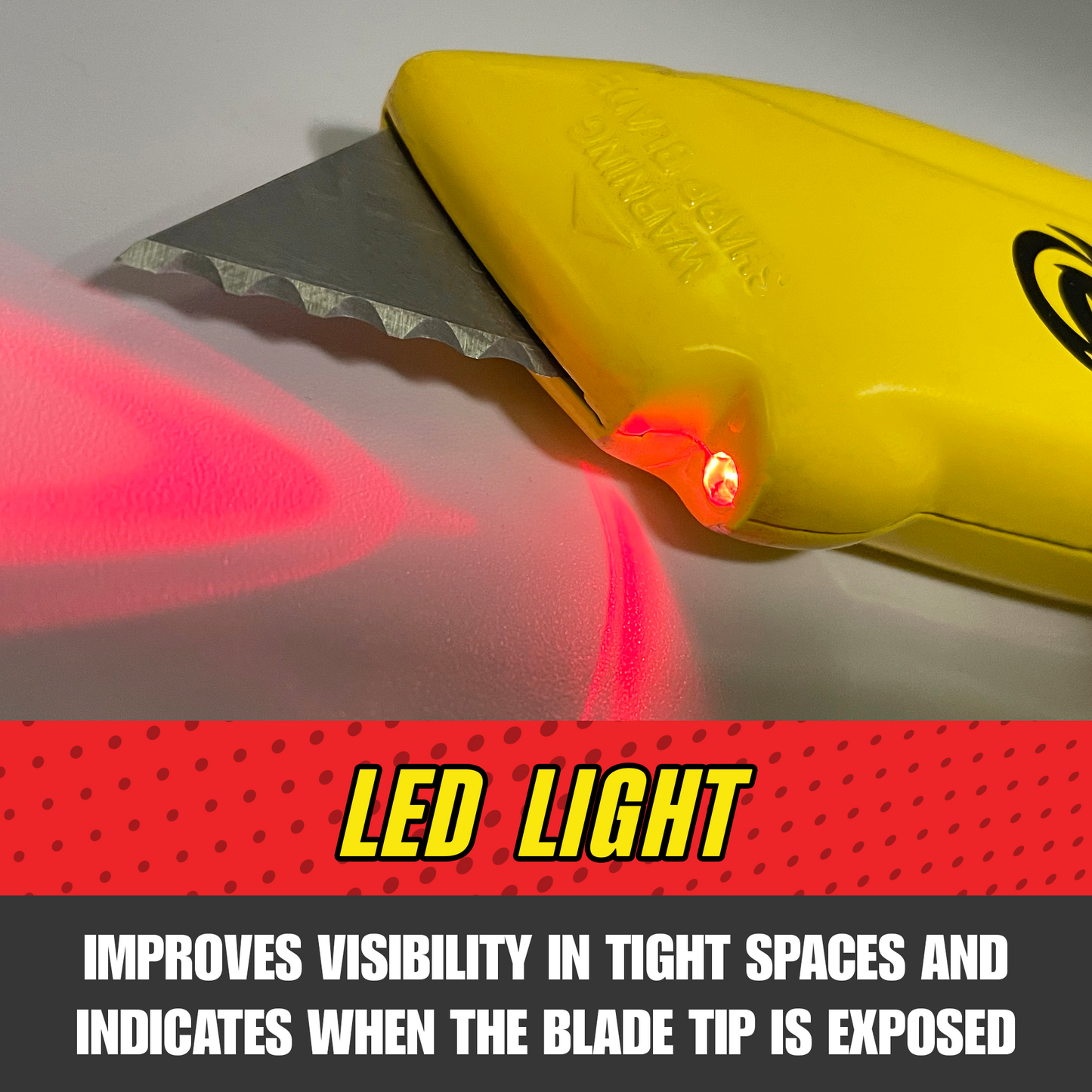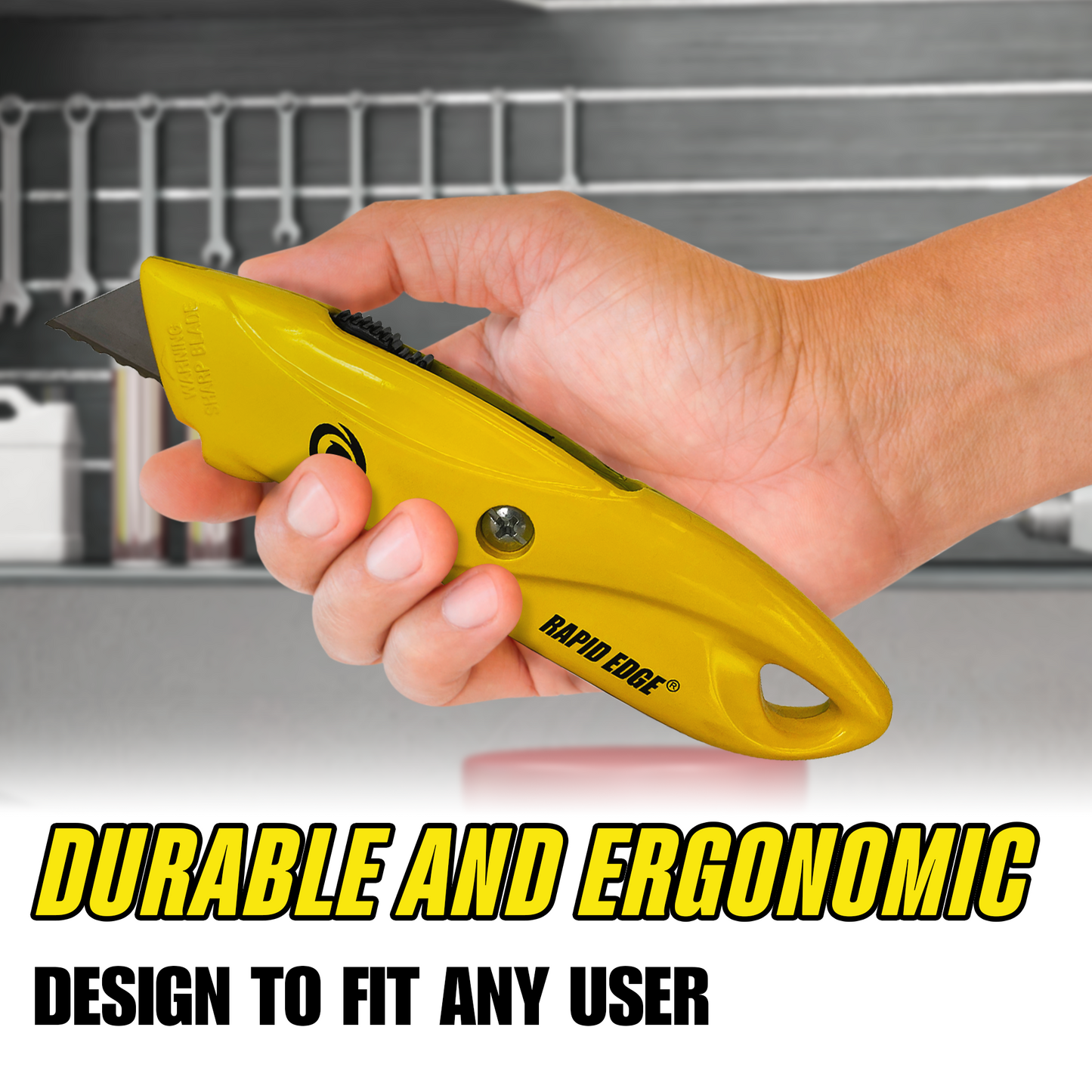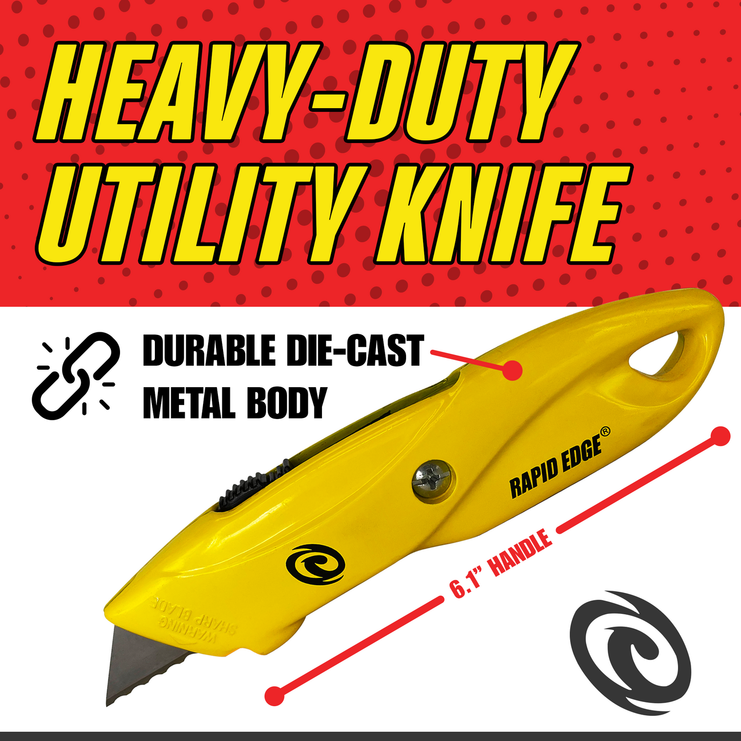 The Rapid Edge utility knife delivers sharper, faster cuts with its serrated blade that glides through cardboard, rope, carpet, and more. Its unique Safe-T-Vue handle lights up when the blade is extended, making it easier to see your cutting line, even in tight or low-light spaces. Built tough with a die-cast metal body and a comfortable 6.1-inch ergonomic handle, this knife stands up to daily use. The slide-and-lock mechanism lets you adjust blade length quickly and keeps it firmly in place for precise cutting every time.